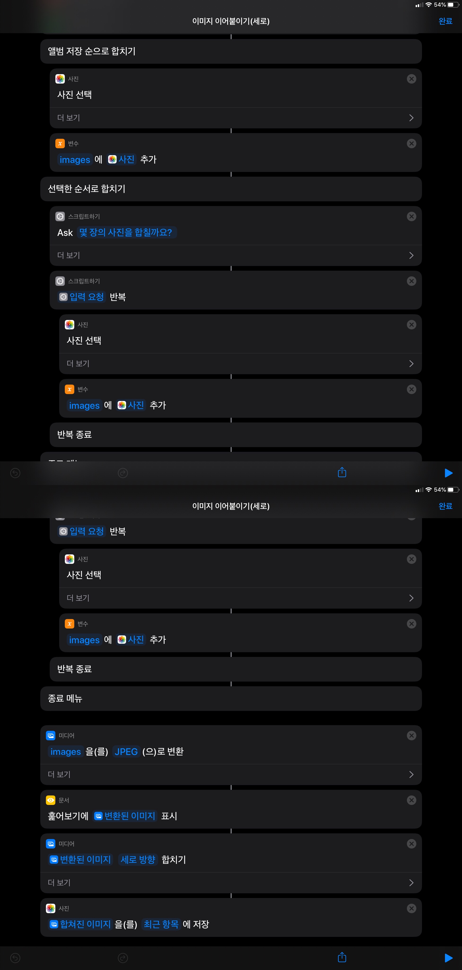 기존에 흔히 구할 수 있는 단축어는 앨범에 저장된 순서대로 이어붙이기만 가능하다. 순서대로 이어붙이기 위해서는 뭐 다른 방법이 있겠지만 그냥 한 장씩 선택해서 이를 이어붙이는 수 밖에 없을 것 같다.