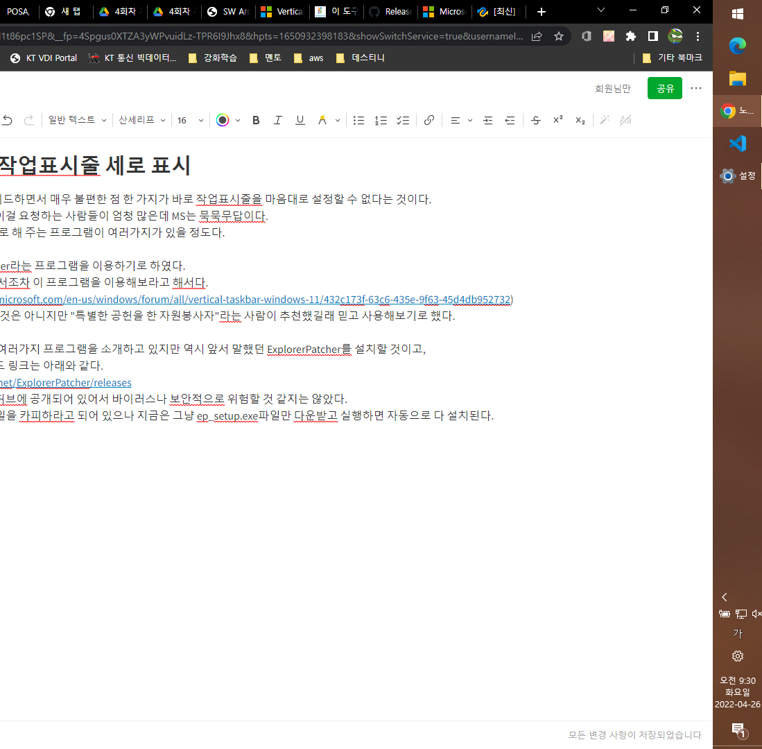 윈도우즈11로 업그레이드하면서 매우 불편한 점 한 가지가 바로 작업표시줄을 마음대로 설정할 수 없다는 것이다.